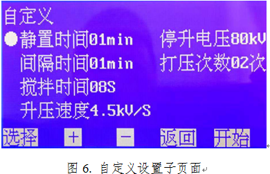 停升电压 可选范围10~80 kV(档位增量10kV)。当仪器升压到停升电压以后将停止升压,并进入到保持状态。若持续15 s无击穿,仪器将默认当前停升电压为绝缘油击穿电压;