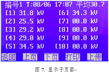 7. 每次击穿电压值和轮回次数自动存储,测量完毕后显示测试完毕,然后按确认键返回到开机页面(图1),按打印或显示键进入油杯每次击穿电压值和平均值的存储记录(图7)。